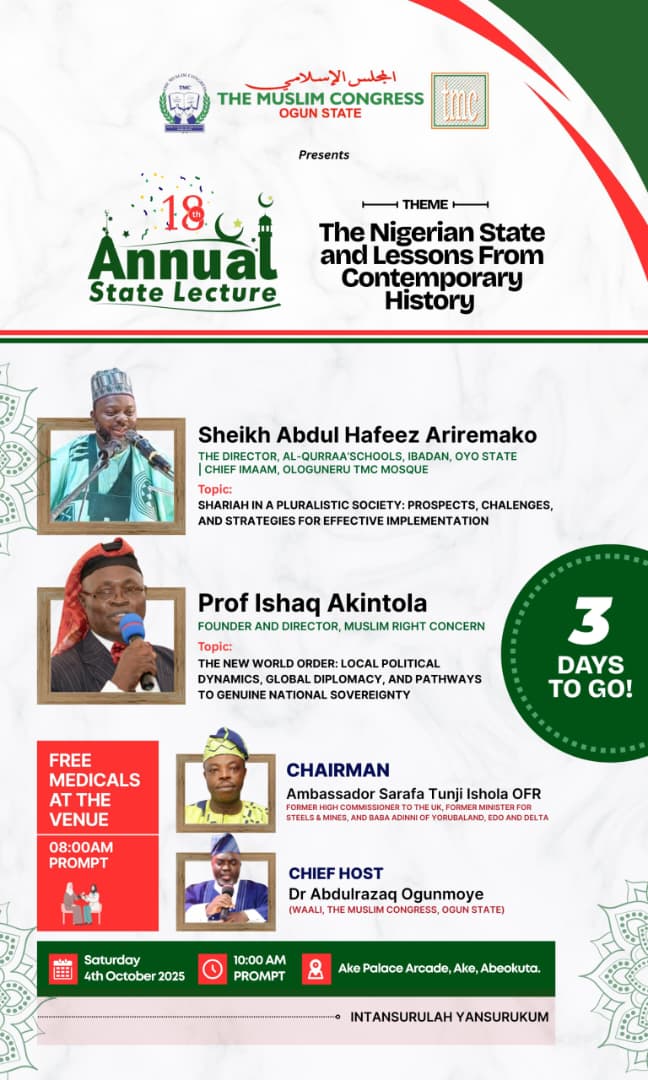 In commemoration of Nigeria’s 65th Independence anniversary, The Muslim Congress (TMC), Ogun State chapter has finalized plans to offer free medical services to people of Ogun State on Saturday 4th October 2025 at the Ake palace arcade in Abeokuta.