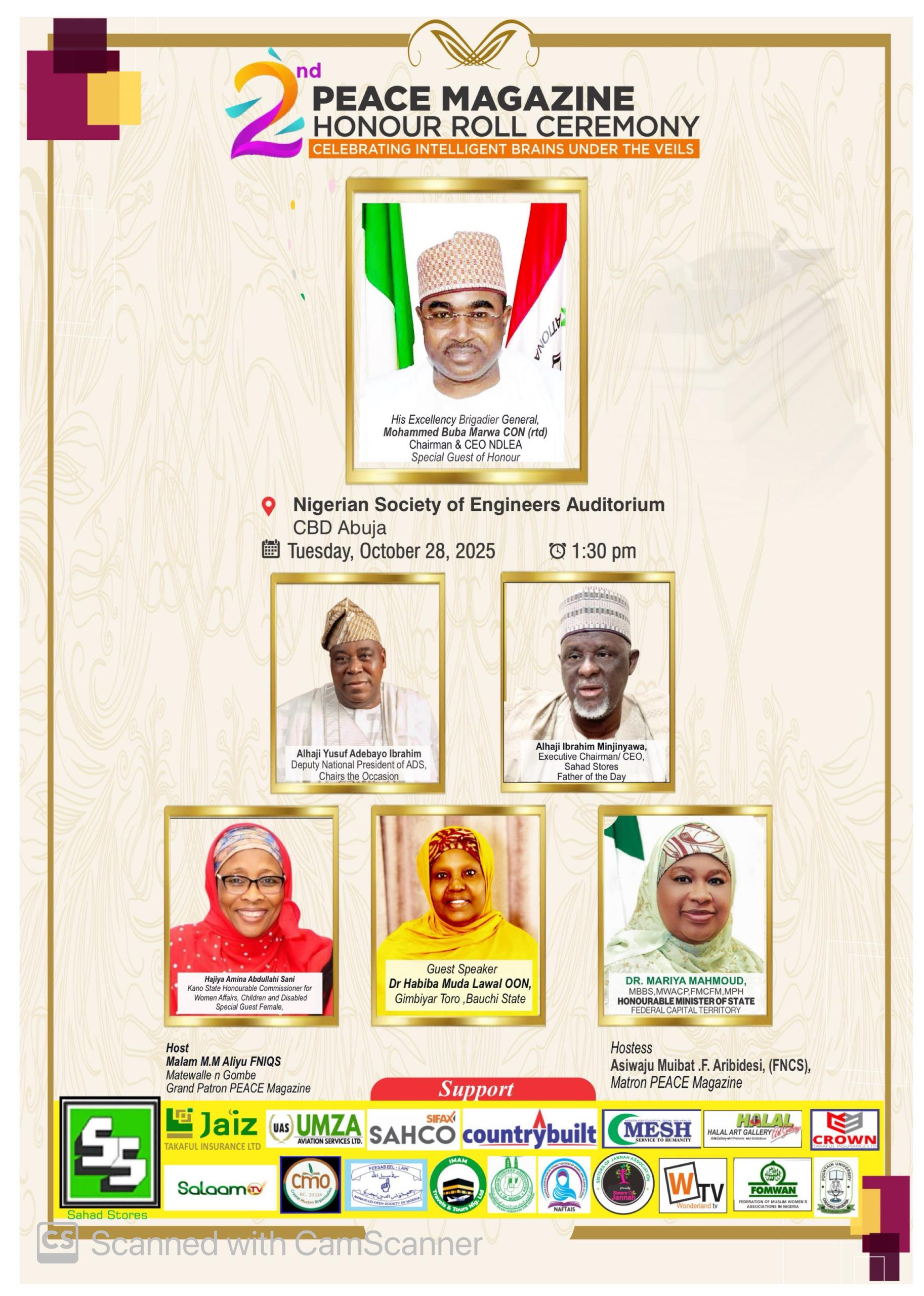 AS-SALAAM PEACE Magazine has announced the second edition of its highly anticipated Honour Roll Ceremony, scheduled to hold on Tuesday, October 28, 2025, at the Nigerian Society of Engineers Auditorium, Central Business District, Abuja, by 1:30 p.m.
