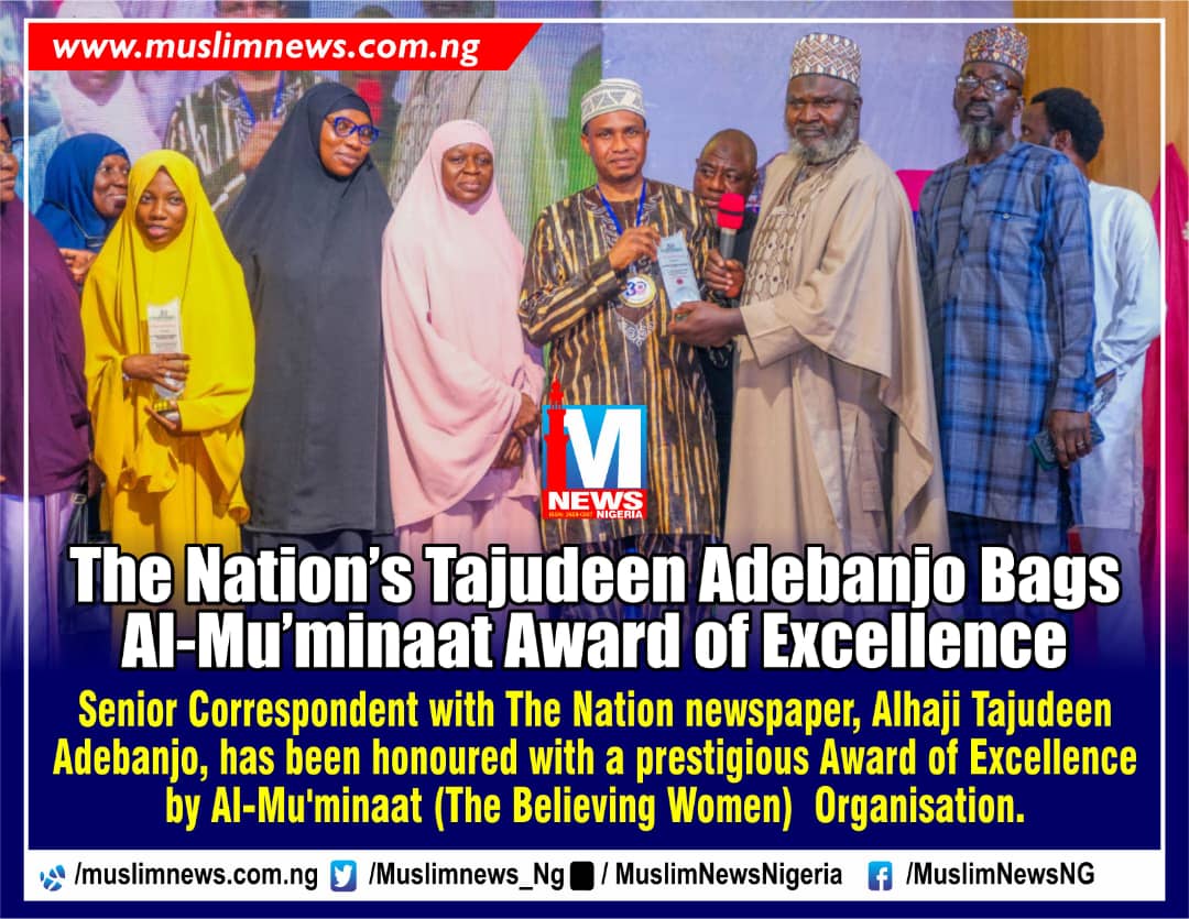 Senior Correspondent with The Nation newspaper, Alhaji Tajudeen Adebanjo, has been honoured with a prestigious Award of Excellence by Al-Mu’minaat (The Believing Women) Organisation.