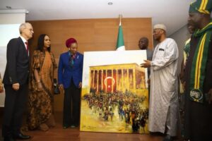 Presentation of a large framed portrait of Anıtkabir, the mausoleum of Mustafa Kemal Atatürk, during the celebration of Türkiye’s 102nd Republic Day anniversary in Abuja.