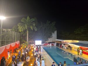 The beautifully illuminated poolside of the Turkish Embassy, glowing with vibrant lights during the 102nd Republic Day celebration.