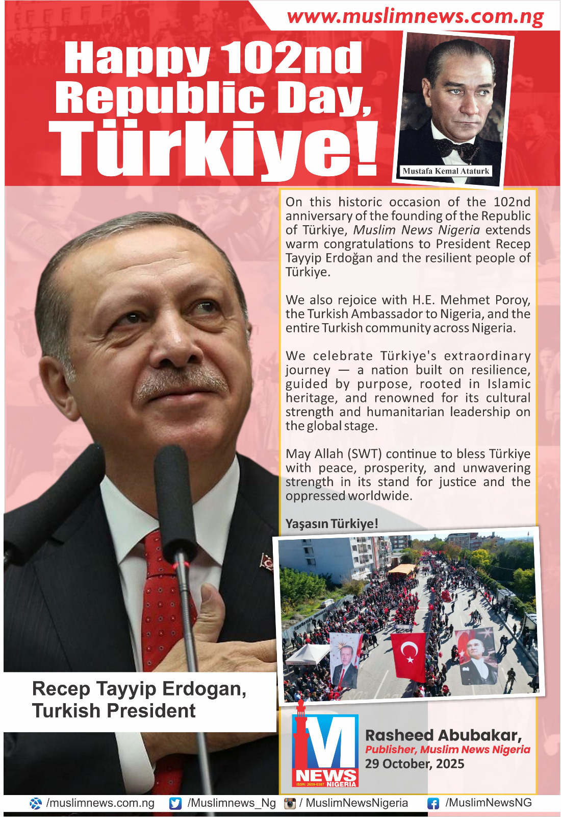 On this historic occasion of the 102nd anniversary of the founding of the Republic of Türkiye, Muslim News Nigeria extends warm congratulations to President Recep Tayyip Erdoğan and the resilient people of Türkiye.