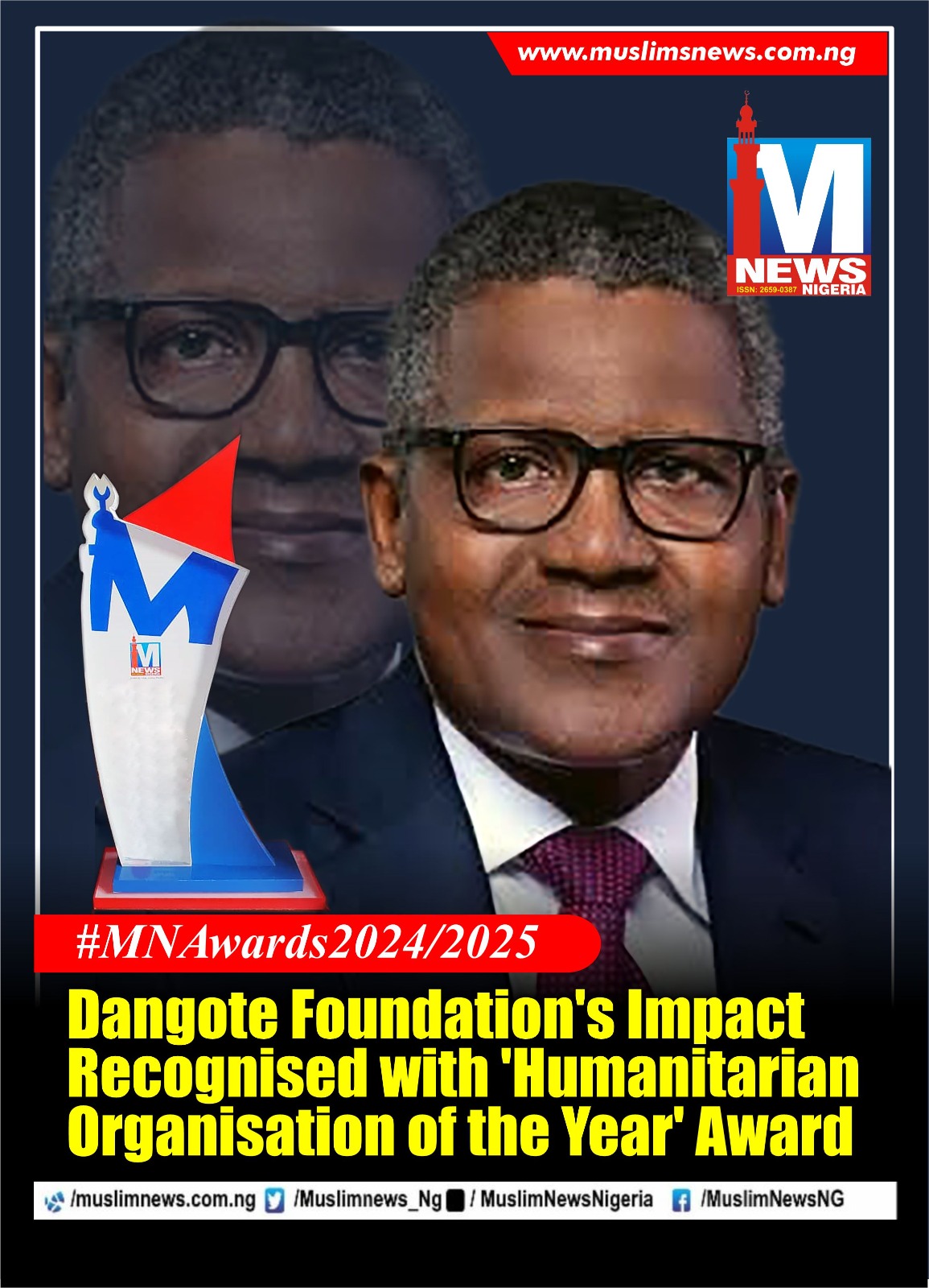 The Aliko Dangote Foundation (ADF) has been honoured with the Humanitarian Organisation of the Year award in the 2024/2025 edition of the Global and Nigerian Muslim Personality Awards (#MNAwards), organised by Muslim News Nigeria, the country’s leading Islamic newspaper.