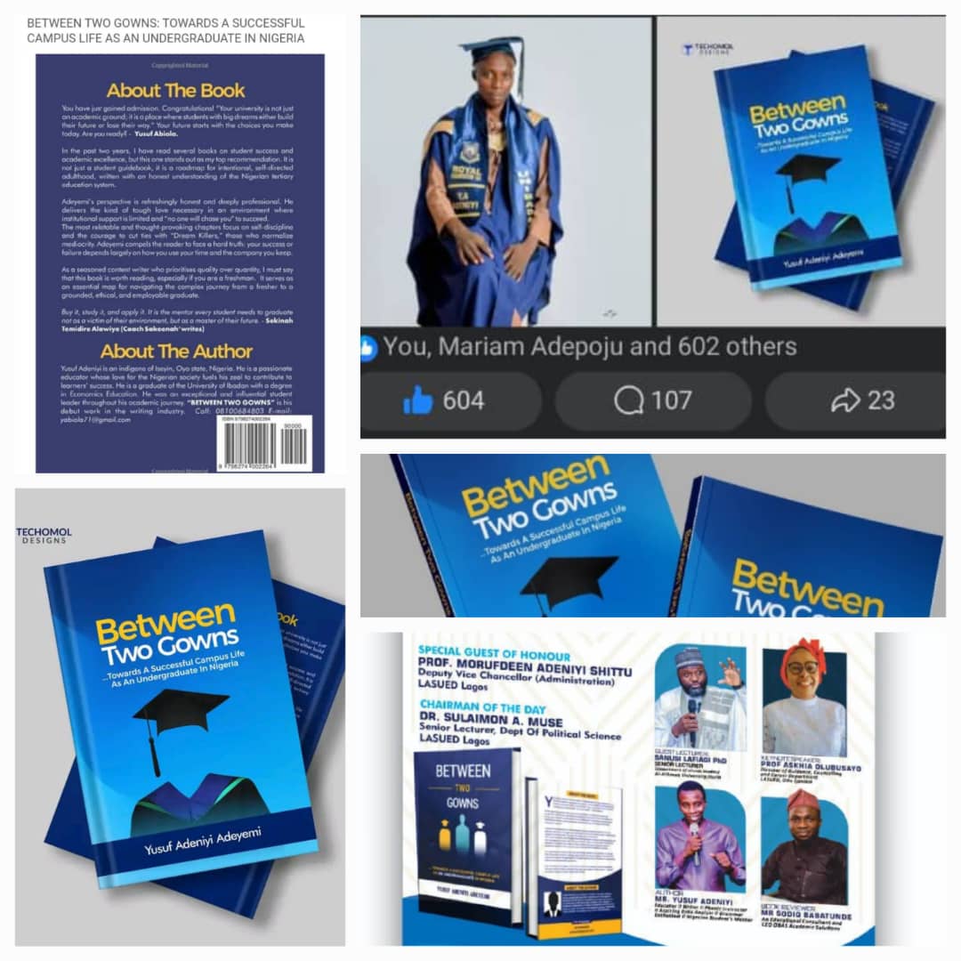 Between Two Gowns: A Practical & Moral Compass for Nigerian Undergraduates is currently available in hard copy. The book is written to guide secondary school leavers and undergraduates on navigating academic life with clarity, discipline, and strong moral values, especially within the Nigerian context. It addresses academic focus, character development, campus life decisions, and future preparedness.