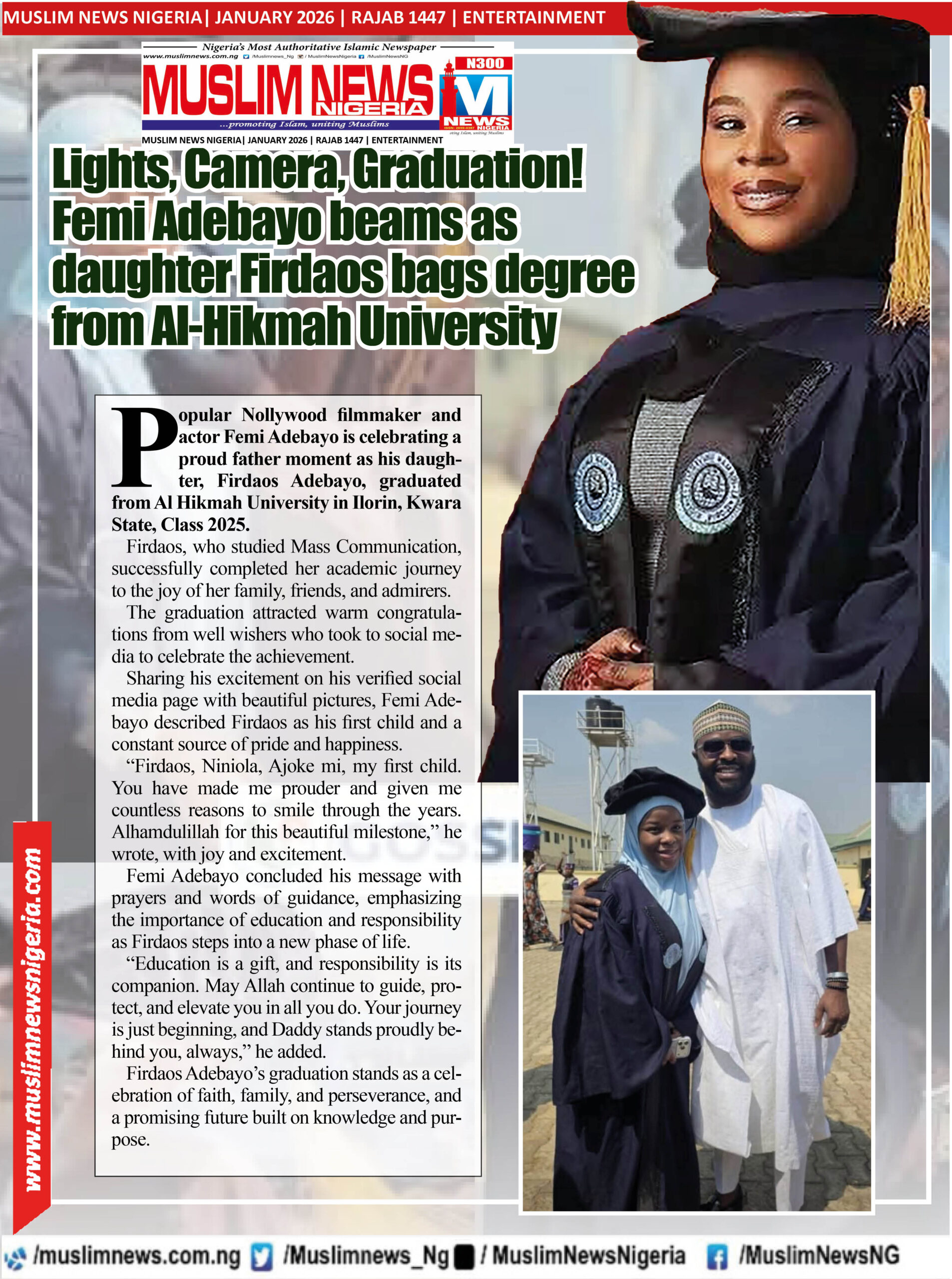 Popular Nollywood filmmaker and actor Femi Adebayo is celebrating a proud father moment as his daughter, Firdaos Adebayo, graduated from Al Hikmah University in Ilorin, Kwara State, Class 2025.