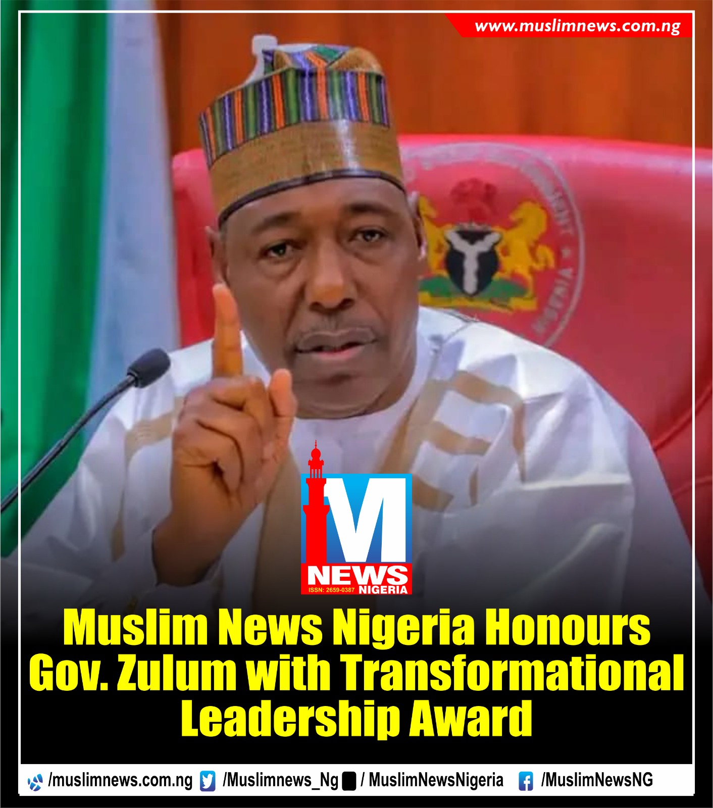 The Governor of Borno State, Professor Babagana Umara Zulum, has been named the recipient of the Muslim News Nigeria Transformational Leadership Award 2025 in recognition of his exceptional, people-centred governance and far-reaching impact in public service.