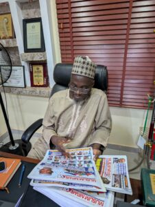 Prof. AbdulRasaq Alaro admires the cover of the newspaper.