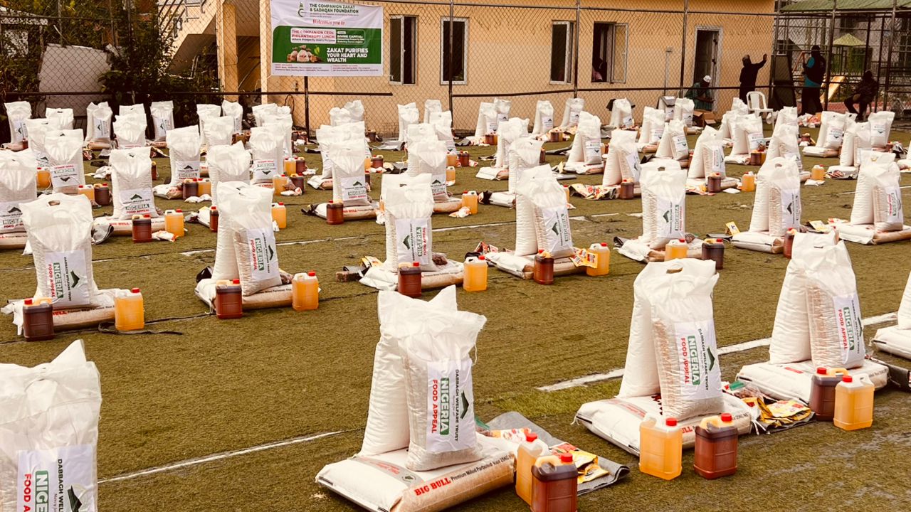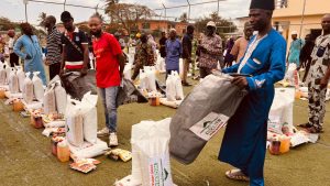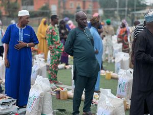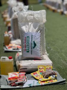 The food distribution featured essential items including 25 kg of rice, 10 kg of beans, 10 kg of garri, palm oil, groundnut oil, tomato paste, and dates.