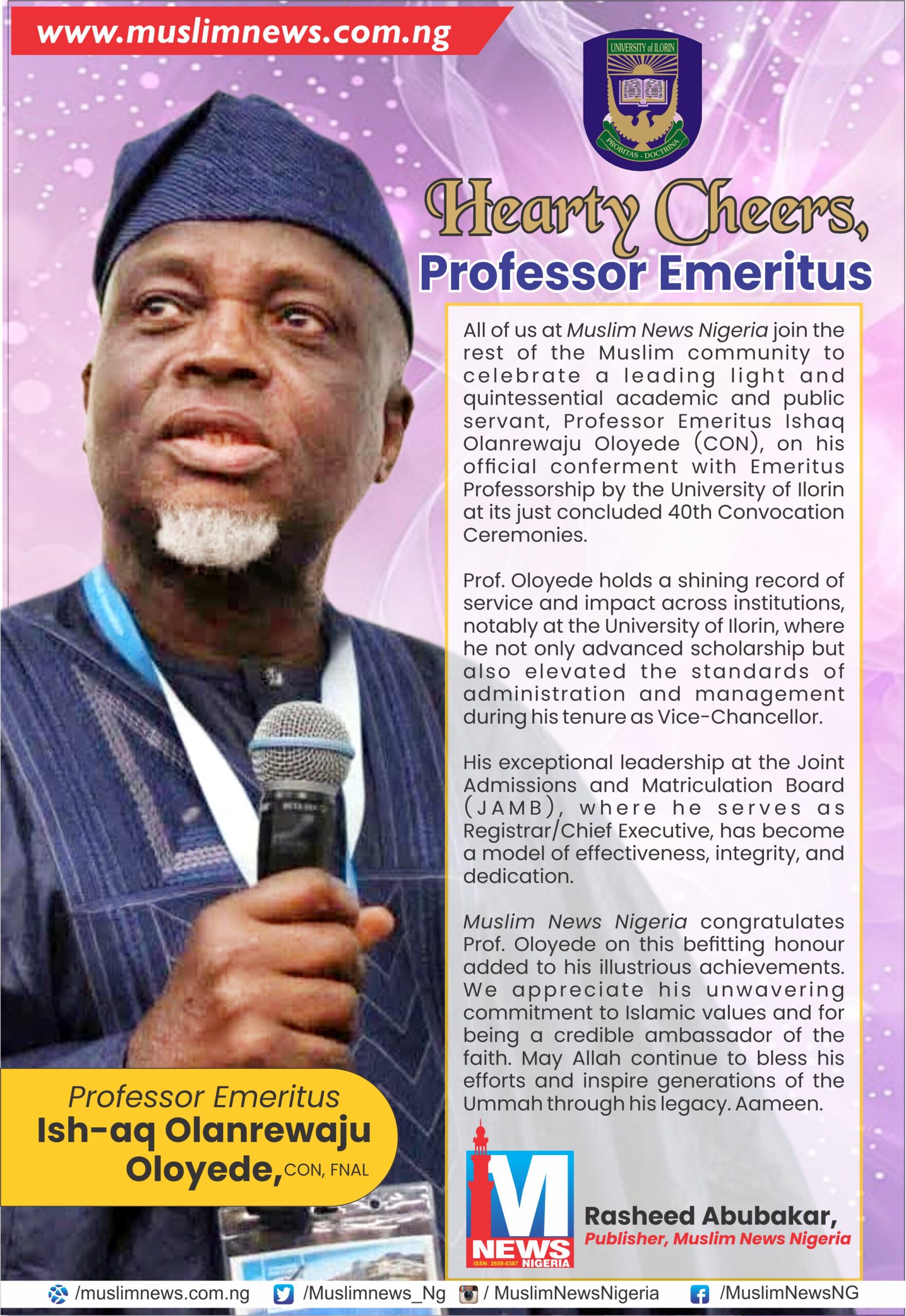 All of us at Muslim News Nigeria join the rest of the Muslim community to celebrate a leading light and quintessential academic and public servant, Professor Emeritus Ishaq Olanrewaju Oloyede (CON), on his official conferment with Emeritus Professorship by the University of Ilorin at its just concluded 40th Convocation Ceremonies.